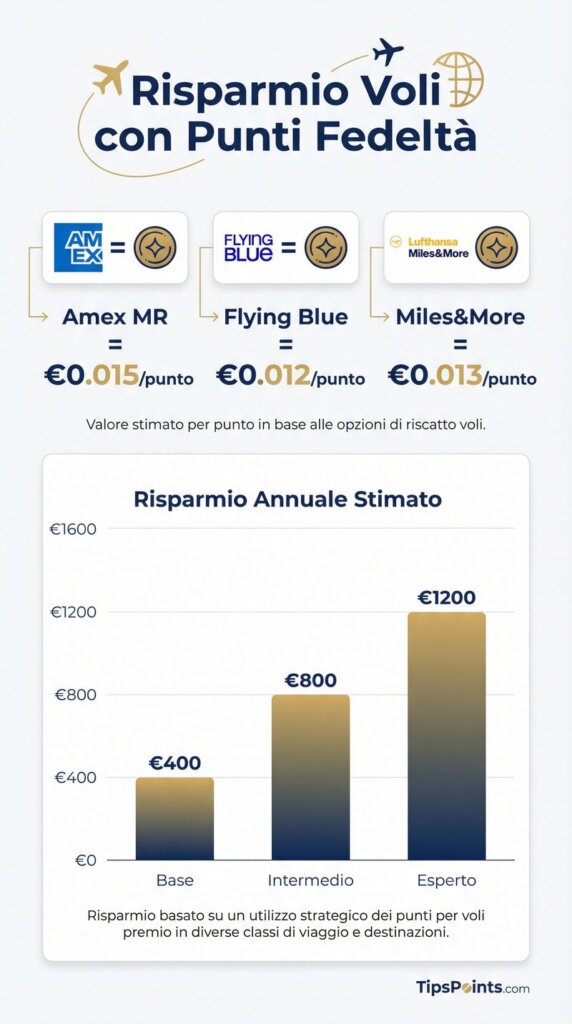 Hai mai pensato a quanto potresti risparmiare sui tuoi prossimi voli semplicemente usando i punti fedeltà che già accumuli? La nostra infografica settimanale ti mostra in modo visivo i risparmi medi ottenibili con i principali programmi fedeltà delle compagnie aeree.